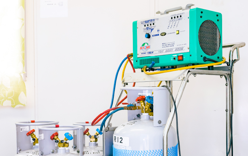 ボンベなどの容器へ回収するため、フロン回収機を使用しています。